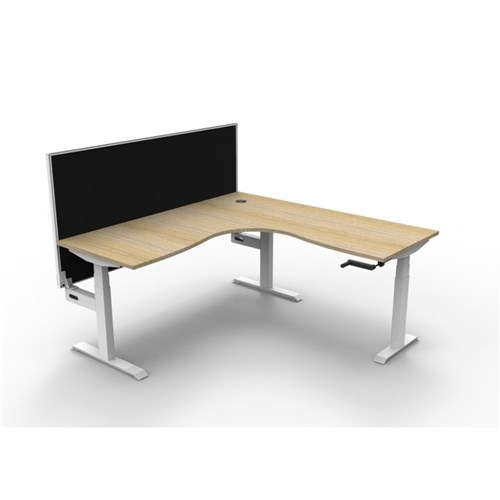 Rapidline Boost manual crank height adjustable corner workstation with screen. Natural oak top with white frame. Dimensions: 1800W x 1500W x 750D x 705mm - 1155mmH. Frame Height: 680mm - 1130mm. Max Speed: 15mm per second (10mm per full turn circle). 1800W x 30T x 900mmH pinnable privacy screen finished in grey fabric with matching white powder coated extrusion. Column Size: 90mm x 60mm. Foot Size: 700mm for main desk and 500mm for return frame. E0 Rated 25mm thick table top with rigid edging and 80mm diameter cable entry with cover. Adjustable leveling feet. Desk mounting top plate size: 500mm. Steel Gauge: 3.0mm, 2.0mm and 1.5mm used throughout. 10 Year Manufacturer's Warranty. Delivery, installation and assembly charges may apply to furniture. Please enquire to confirm.
