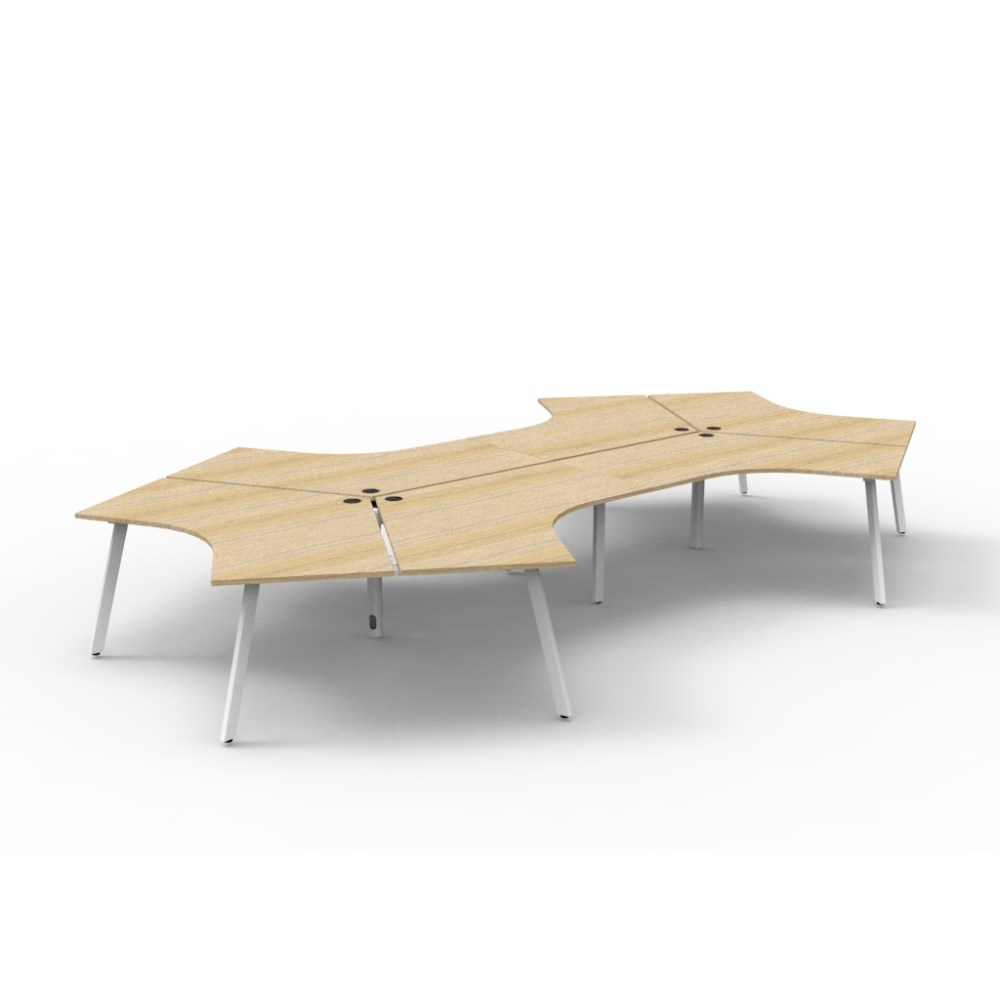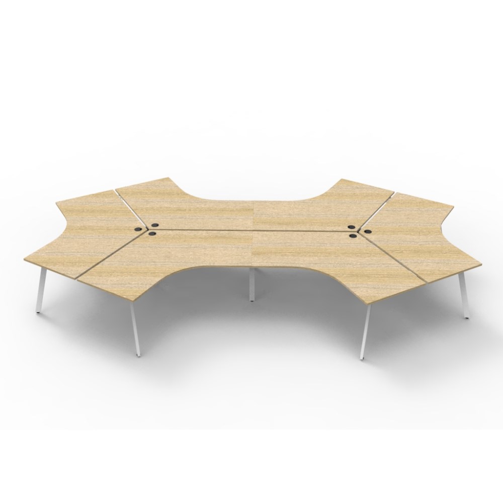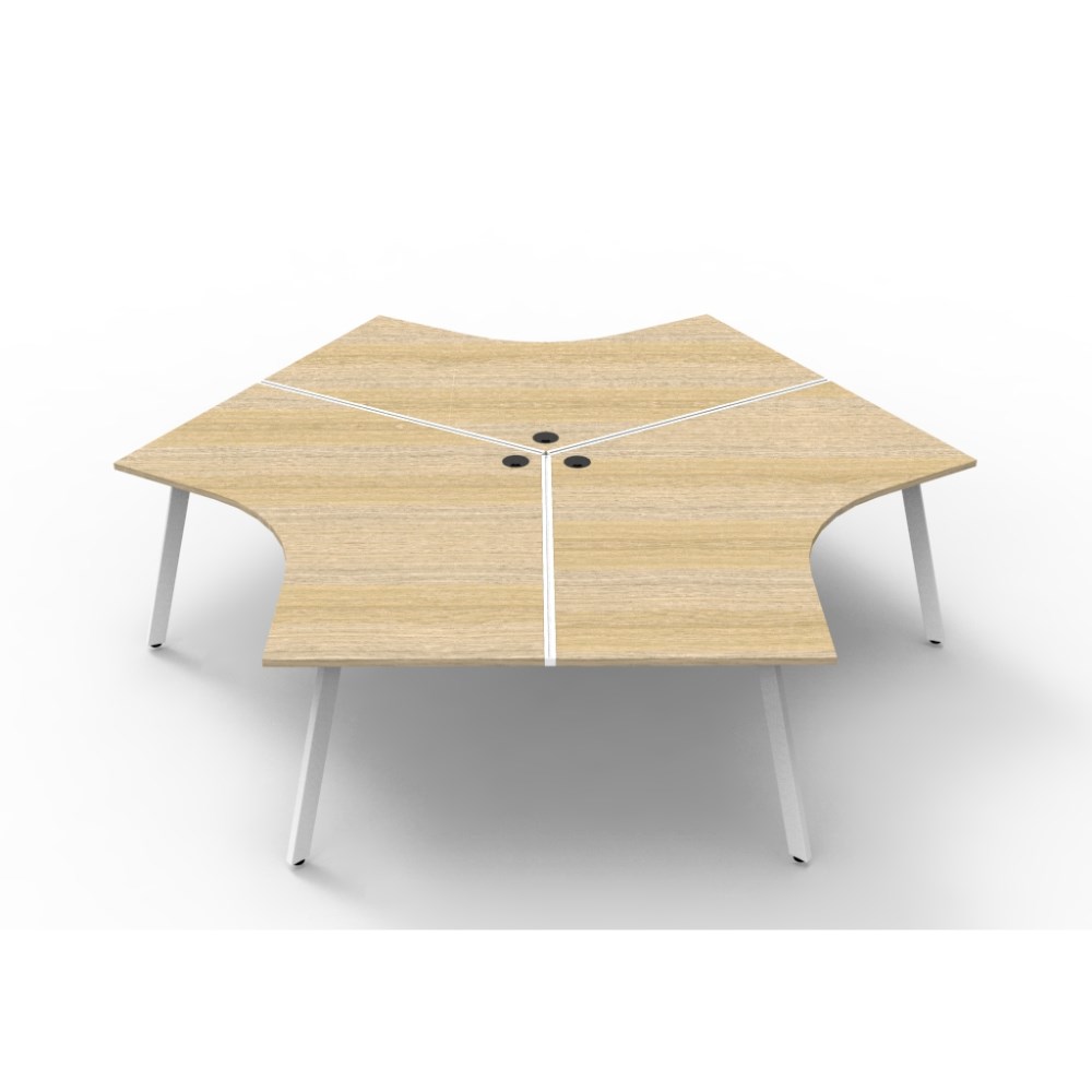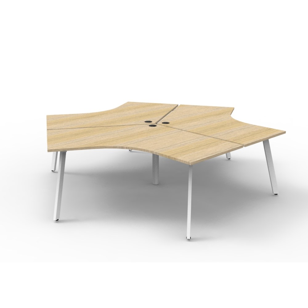 Overall Dimensions: 2866W x 2480D x 730mmH. Dimensions Per User: 1205W x 1205D x 730mmH. Natural oak worksurface with a 60 x 30mm powder coated white Eternity leg underframe. 1 x 80mm diameter cable entry hole. 30mm cable access void in between double sided users. Infill rail available at additional cost. Dual cross bar for added stability. E0 enviroboard melamine worksurface. Adjustable leveling feet. 5 Year Manufacturer's Warranty. Delivery, installation and assembly charges may apply to furniture. Please enquire to confirm.