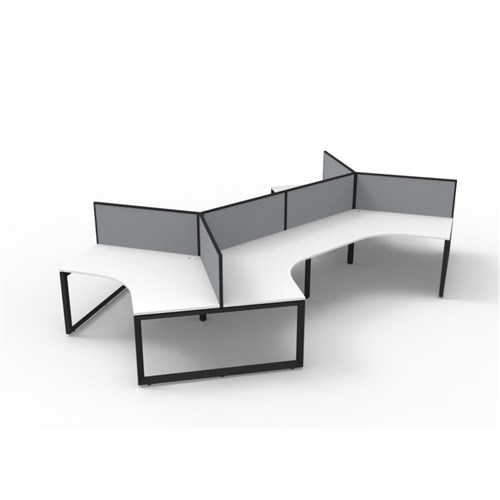 Overall Dimensions: 2866W x 2480D x 1200mm H. Per User Dimensions: 1205W x 1205D x 730mmH. White worksurface with a 60 x 45mm powder coated black Loop leg underframe and screen. 495mm high x 30mm thick pinnable privacy screen upholstered in grey fabric with matching powder coated extrusion. 1 x 80mm diameter cable entry hole. 30mm cable access void in between double sided users. Infill rail available at additional cost. Dual cross bar for added stability. E0 enviroboard melamine worksurface. Adjustable leveling feet. 5 Year Manufacturer's Warranty. Delivery, installation and assembly charges may apply to furniture. Please enquire to confirm.