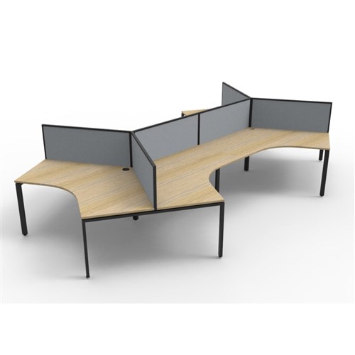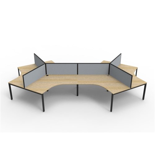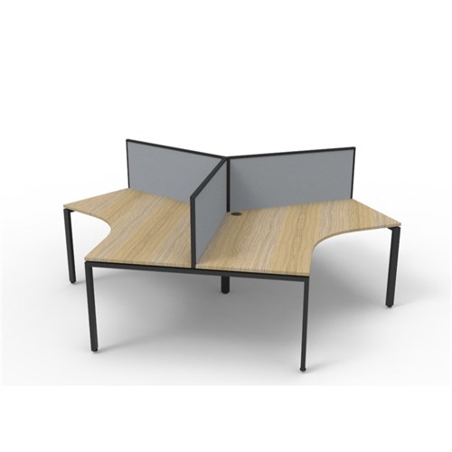 Overall Dimensions: 2866W x 2480D x 1200mm H. Per User Dimensions: 1205W x 1205D x 730mmH. Natural oak worksurface with a 60 x 30mm powder coated black Profile leg underframe and screen. 495mm high x 30mm thick pinnable privacy screen upholstered in grey fabric with matching powder coated extrusion. 1 x 80mm diameter cable entry hole. 30mm cable access void in between double sided users. Infill rail available at additional cost. Dual cross bar for added stability. E0 enviroboard melamine worksurface. Adjustable leveling feet. 5 Year Manufacturer's Warranty. Delivery, installation and assembly charges may apply to furniture. Please enquire to confirm.