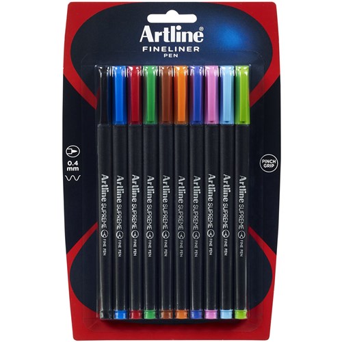 artline supreme fineline pens offer a fun and contemporary design with leading functionality. writes for over 1,300m curved pinch grip system ideal for writing comfort 0.4mm line width modern curved design water based ink - wont bleed through paper convenient hard case packaging for a pack and go solution
