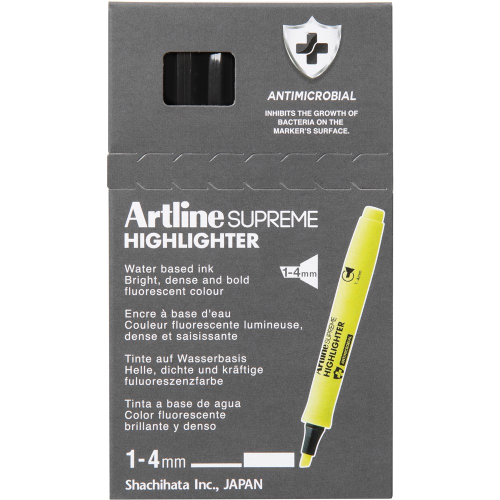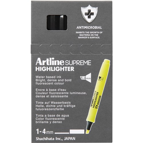 artline supreme highlighters offer a fun and contemporary design with leading functionality. ideal for all students and teens needs. 2mm to 5mm chisel nib ergonomic shape designed to fit neatly into your hand gloss, smooth grip for easy comfort writing bright dye-stuff ink for long-lasting neon colour available in yellow, pink, orange & green