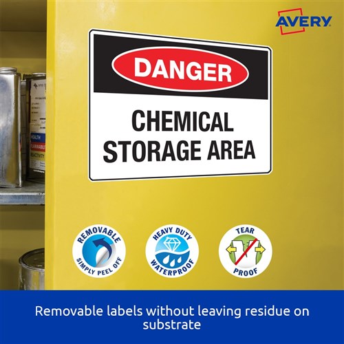 Durable polyester removable labels! Weather resistant labels ideal for indoor and outdoor applications. Removable without leaving residue on substrates. UV, oil and dirt resistant and unaffected by temperature variations -20°C to +80°C. Applications: ideal for creating temporary signage, labelling equipment, facilities and storage supplies. Marking inventory, stock take and temporary pallet identification. Sheet size: A4 available in multiple label sizes. Designed for laser printers. Customisable using Avery design & print online templates.
