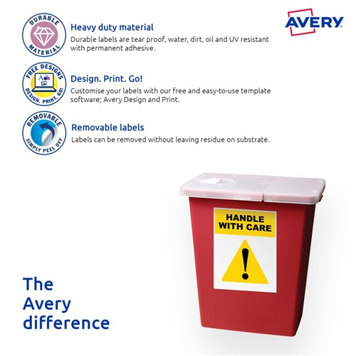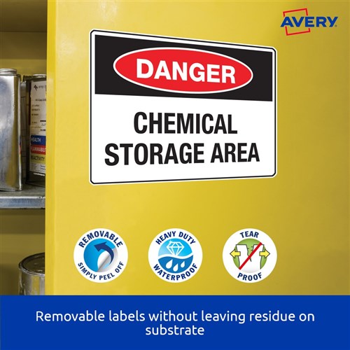 Durable polyester removable labels! Weather resistant labels ideal for indoor and outdoor applications. Removable without leaving residue on substrates. UV, oil and dirt resistant and unaffected by temperature variations -20°C to +80°C. Applications: ideal for creating temporary signage, labelling equipment, facilities and storage supplies. Marking inventory, stock take and temporary pallet identification. Sheet size: A4 available in multiple label sizes. Designed for laser printers. Customisable using Avery design & print online templates.
