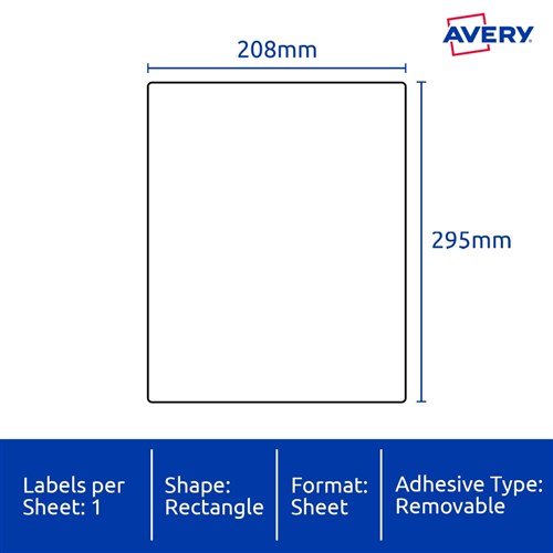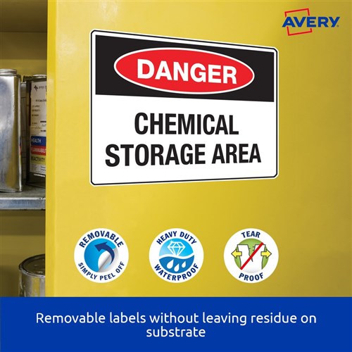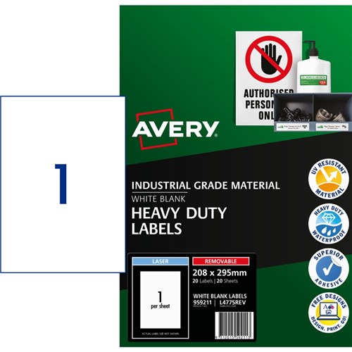Durable polyester removable labels! Weather resistant labels ideal for indoor and outdoor applications. Removable without leaving residue on substrates. UV, oil and dirt resistant and unaffected by temperature variations -20°C to +80°C. Applications: ideal for creating temporary signage, labelling equipment, facilities and storage supplies. Marking inventory, stock take and temporary pallet identification. Sheet size: A4 available in multiple label sizes. Designed for laser printers. Customisable using Avery design & print online templates.