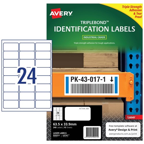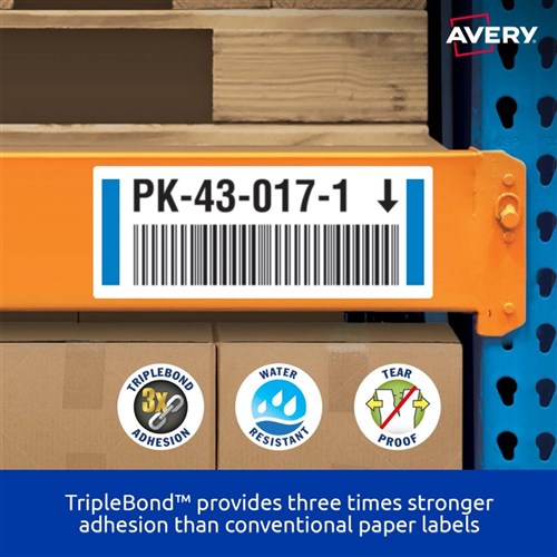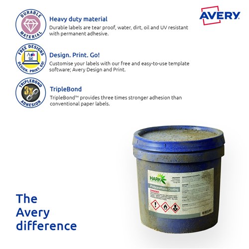 Three times stronger for tough outdoor applications! Triplebond Tough labels engineered for permanent identification. Durable labels which are oil and dirt resistant, water resistant and tear-proof. Unaffected by temperature variations -40°C to +100°C. Applications: ideal for outdoor applications. For permanent identification for warehouse pallets, racking, machinery and equipment. Identifying outdoor scaffolding, pallet racking, drums, containers, storage cabinets, portable floor stands and barriers. Customisable using Avery design & print online templates.