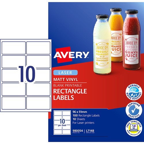 Avery Durable Laser Labels L7148 96X51Mm Rectangle White 10Up 100 Labels 10 Sheets