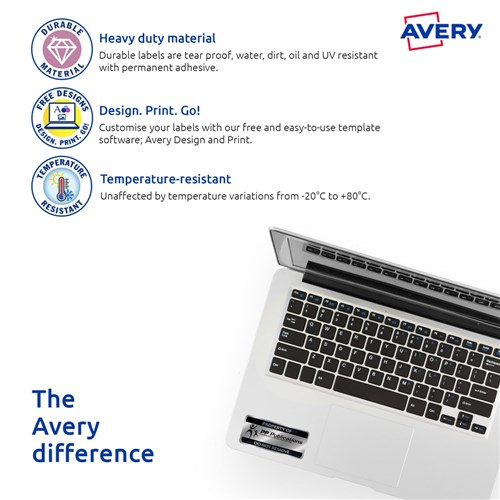 Ideal to mark your property with your contact details or to label products Oil and dirt resistant splash proof tear and unaffected by temperature changes between - 20 + 80 C UV resistant water and weatherproof More durable than normal paper label Available in white and metallic silver Supported by the free Avery templates available at averyproducts com au/print