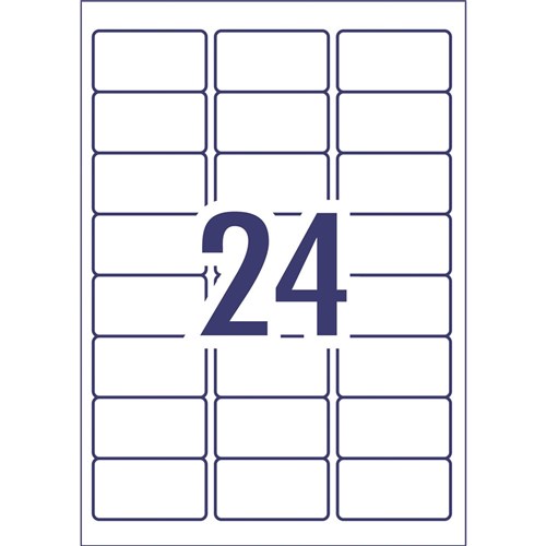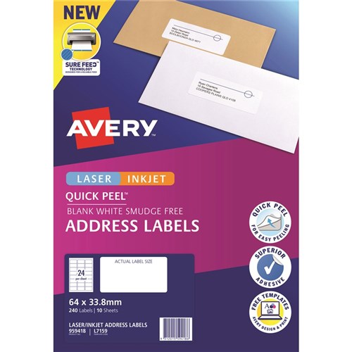 24 Labels per page Sure Feed technology is designed for a reliable feed through your printers, saving time and minimising wastage Quick Peel technology allows for quicker and easier detachment of labels from backing sheet Customise your labels with our free and easy-to-use template software; Avery Design and Print - available at averyproducts.com.au/print Special adhesive withstands the high heat of laser printers FSC© certified labels made with paper from well-managed forests