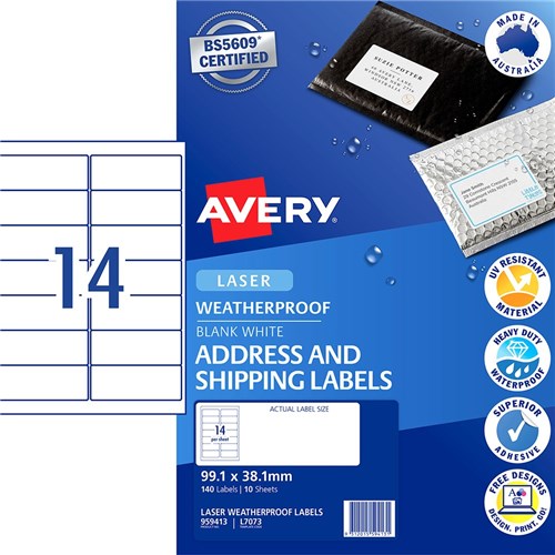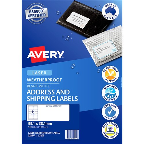 Durable, water-resistant labels provide strong protection against harsh elements UV-resistant, water-resistant and weatherproof Customise your labels with our free and easy-to-use template software; Avery Design and Print - available at averyproducts.com.au/print Jam-Freeâ„¢ reliability for trouble free printing, saving time and minimising wastage Perfect for shipping, addressing, priority messages, warning labels and more