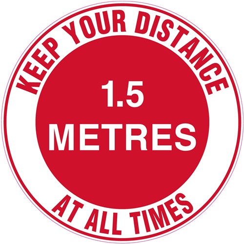 Help minimise the spread of COVID-19 in your facility with Brady's range of hygiene signs and social distancing floor markers Wording: Keep Your Distance 1.5 Metres At All Times Material: Self Adhesive Vinyl With Protective Over Laminate Size:440mm Dia.