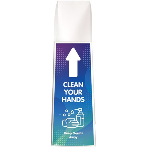 Light weight and portable Printed Illustration To Direct People To Hand Sanitiser & Promote Good Hand Hygiene Can Be Customised, Add Your Logo For Identification Stand Fits Various Hand Sanitiser Pump Bottles From 500 Ml Up To 5L Integrated bottle neck tag to secure hand sanitiser to stand Supplied in flat pack but simple to assemble and no tools required