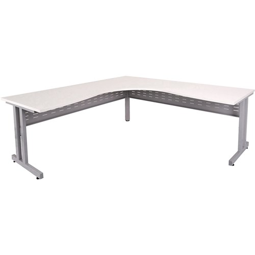 CLEG Corner Workstation - Natural White Top 1500mm x 1500mm x 700mm D x 730mm H Dual Post In Silver P/C with Matching Perforated Modesty Panels E1 Rated Melamine Board 2 x 80mm Dia. Cable Entry Holes 5 Year Manufacturer's Warranty