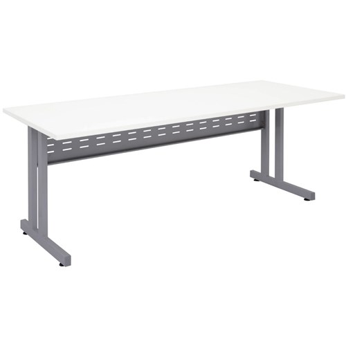 CLEG Corner Workstation - Natural White Top 1200mm W x 700mm D x 730mm H Dual Post In Silver P/C with Matching Perforated Modesty Panels E1 Rated Melamine Board 2 x 80mm Dia. Cable Entry Holes 5 Year Manufacturer's Warranty