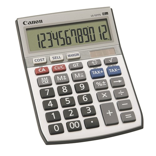 Item Code: CAN-LS121TS Type: Desktop Calculator Dimensions H/W/D: 148x107.5x31mm Features: 12 digit large angled display. Dual powered. Easy-to-use tax/GST function. Includes cost, sell & margin keys. Memory, percentage & square root functions.