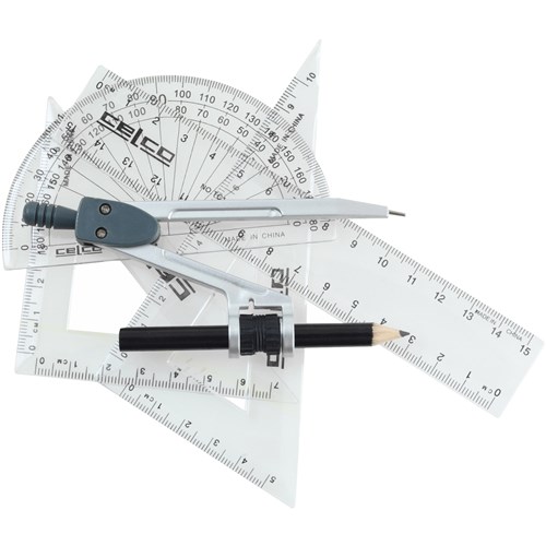 School essential for students Includes compass, pencil and ruler Aslo includes protractor 45/60 degree set squares Available in a reusable hangsell pvc bag