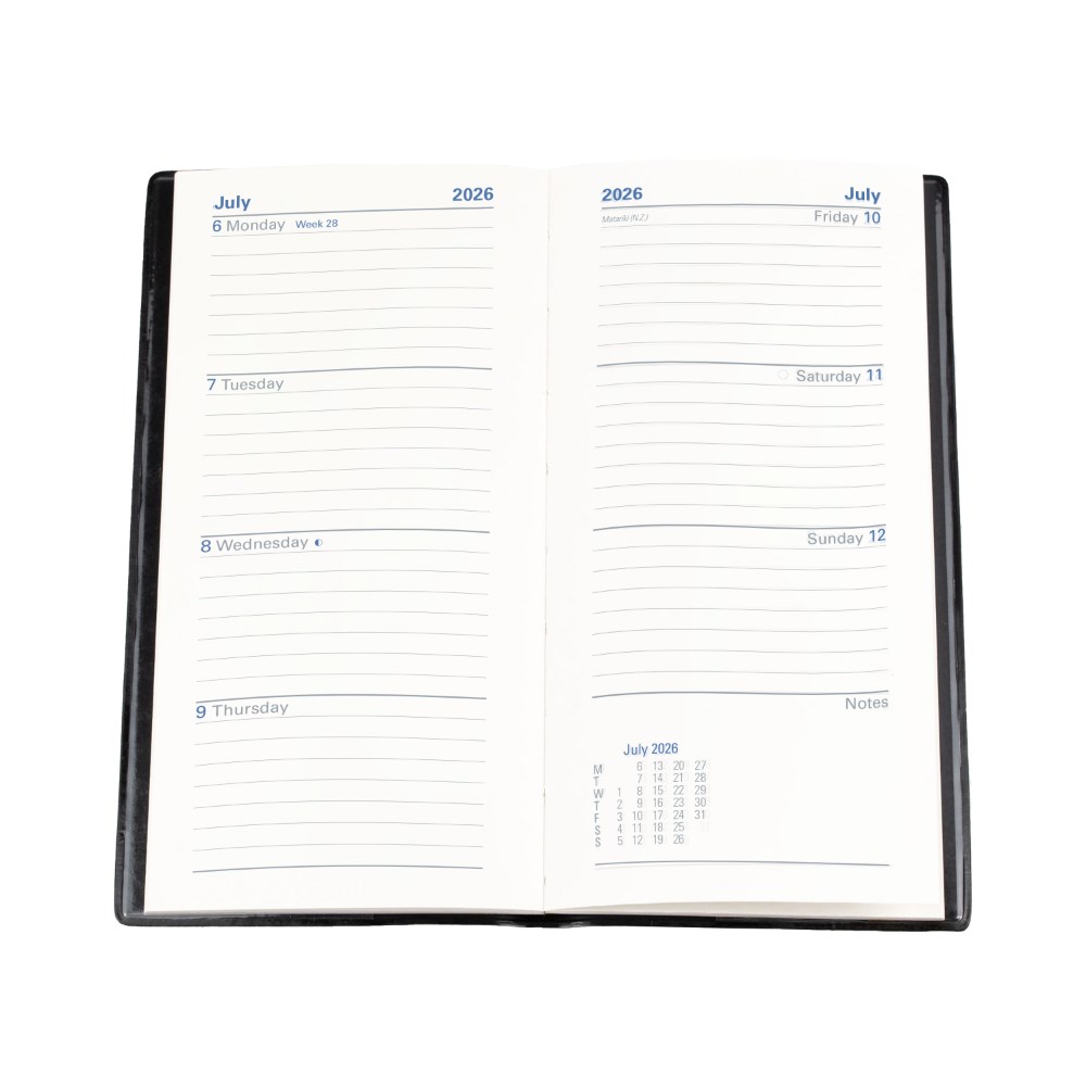 Bound in a highly durable, welded PVC cover, the Belmont series is available in black, cherry red, and navy. Printed on white paper, the series includes features such as appointment times, a six month to opening calendar on each dated page layout, week numbers, Julian days, Australian and international holidays. Features include: three year calendars, calendar notes, current and forward year planners, Australian and New Zealand public holidays and school terms, international dialling, holidays and time zones, 12-monthly planners, staff leave planner The pocket size in Week to View format has a soft flexible cover which makes in an easy fit into your bag