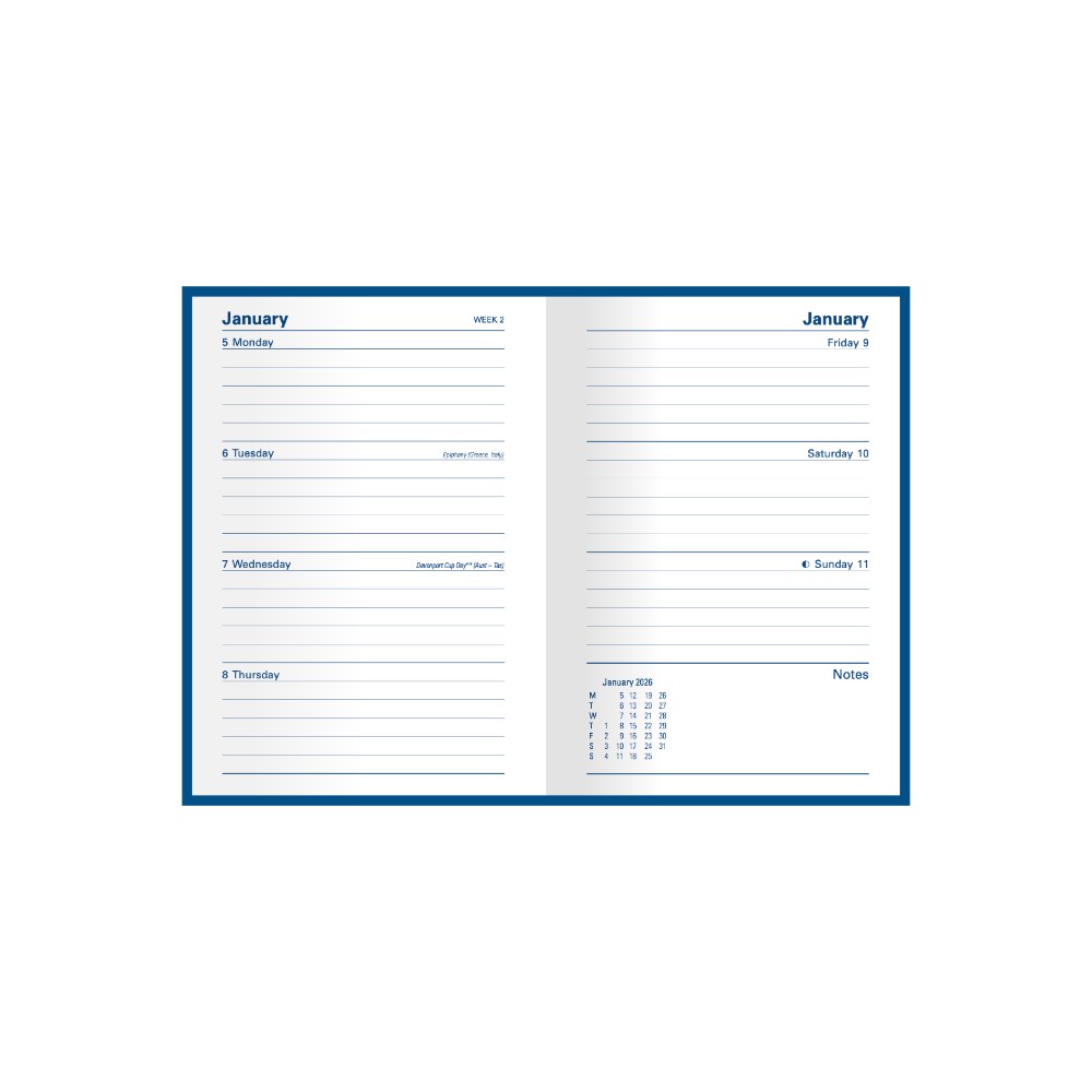 • Lay flat opening, ribbon marker, week to view layout.
