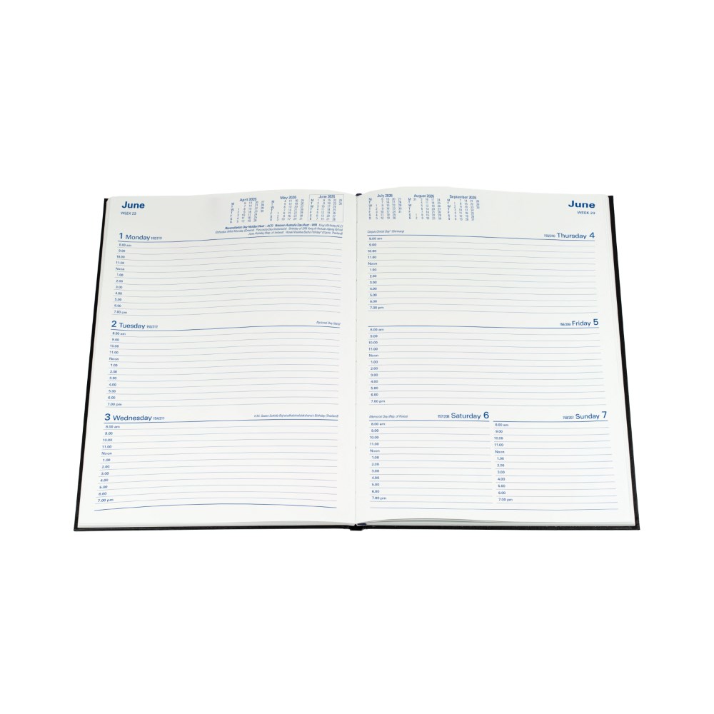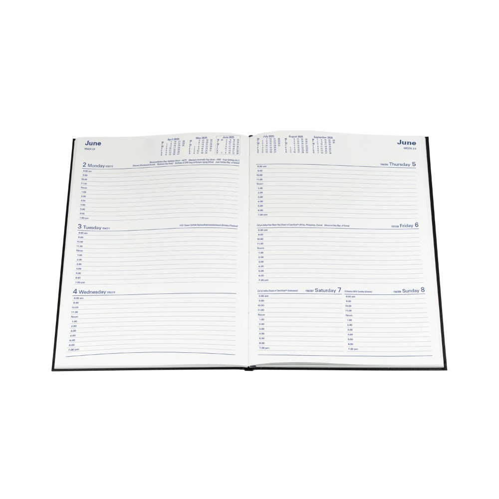 This sophisticated smooth leather-look diary comes complete with all of the features expected of a Collins diary including crisp, easy-to-read graphics, comprehensive information section and Australian, New Zealand and international holidays throughout. Features include: Australian and New Zealand capital city maps and holidays, 3-year calendars, current and forward year planners, international holiday list, international dialling guide, staff leave planner, addresses and notes 1 hour appointment 8am - 7pm