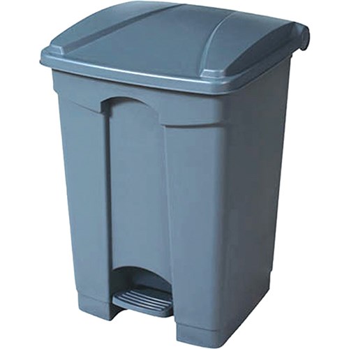 Grey plastic construction Robust foot pedal for touchless waste disposal Easy to clean Size: 50 L x 41 W x 84 H cm