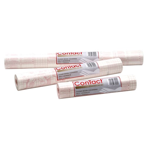 Contact is the premium standard for all book covering needs. Made from high quality clear gloss polypropylene. Non ageing water based repositionable permanent adhesive. Available in 300mm, 375mm, 450mm, 600mm & 900mm widths. 20m lengths. Red grid backing paper with instructions.