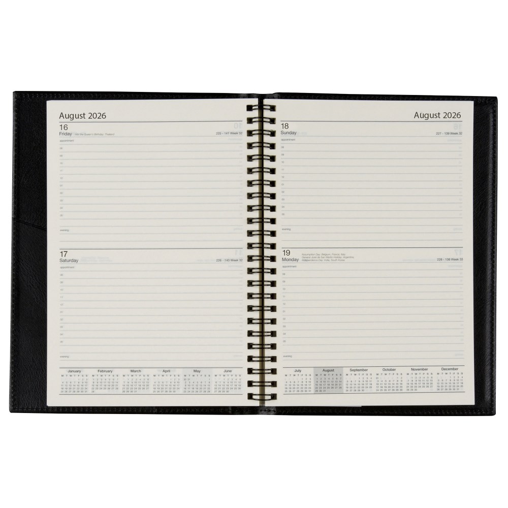 If you prefer a spiral bound diary, our Norwich diary is for you! Featuring a stylish, flexible leathergrain cover, finished with the famous gold foil 'Norwich' logo and fine ivory paper. Available in A4, A5, Quarto, A6 and A7 sizes. Packed with useful information including 3 year reference calendars, weights & measurements, current and forward year planners Includes Australian and New Zealand holidays and school terms. Deluxe pocket inside the front cover. Perfect for holding your receipts. Stitched edges 1 hour appointment 8am - 5pm, Monday to Sunday
