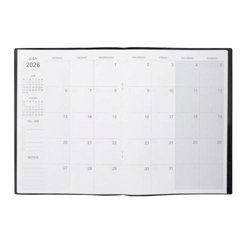 From the classy embossed slip in PVC cover to the comprehensive information section and plethora of note writing space, our Monthly Planner Diaries are the perfect personal assistant for busy executives.. The month to view format has plenty of space to add appointments and notes. Quality white paper with previous, current and future month on each page.. Includes Australian and New Zealand holidays and school terms.. Month to View. Black. A4 size.