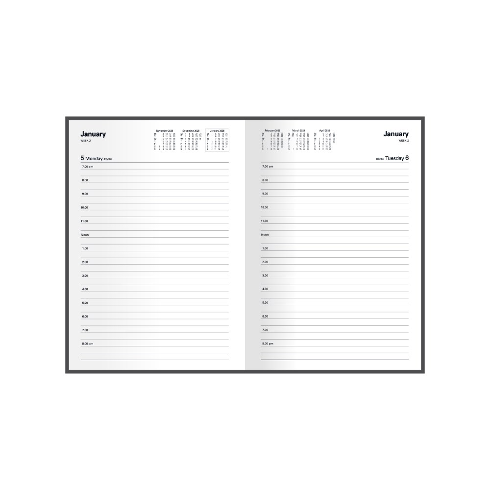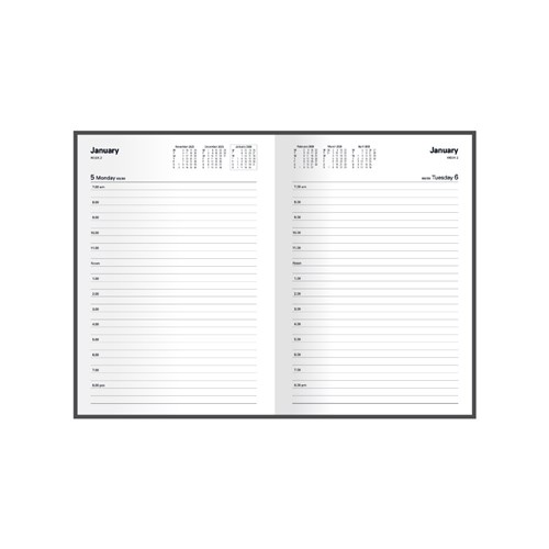Support the environment with the Kyoto range - a series of cost-effective diaries, bound in a durable black cover with silk-satin finish ribbon marker Printed on white recycled paper with distinctive page layouts, the dated pages contain 12-months to opening calendars, week numbers and day counts The A4 and A5 one-day editions also feature full Saturday and Sunday pages, serving as the perfect companion to the range's pocket and slimline editions Features include: recycled paper, Australian and New Zealand holidays, current and forward year planners, international holiday list, international dialling guide 1 hour appointment 7am - 8pm