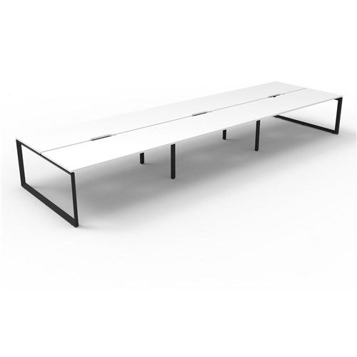 No screen Natural White Worksurface With 410mm W x 50mm D Scallop Cable Access 5400mm W x 1530mm D x 730mm H (Overall),1800mm W x 750mm D x 730mm H Per User 60mm x 45mm Bevelled Edge Loop Leg Underframe In Black Powdercoat 30mm Cable Access Void In Between Double Sided Users - Infill Rail Available At An Additional Cost Adjustable Levelling Feet 5 Year Manufacturer's Warranty