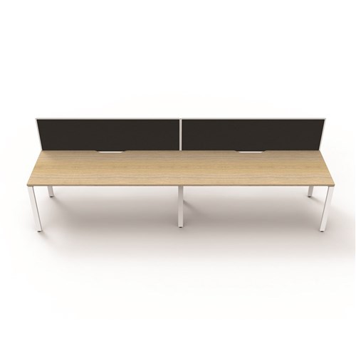With Screen Natural White Worksurface With 410mm W x 50mm D Scallop Cable Access 2400mm W x 780mm D x 730mm H (Overall), 1200mm W x 750mm D x 730mm H Per User 60mm x 30mm Profile Leg Underframe In White P/C 495mm H x 30mm T Pinnable Privacy Screen Upholstered In Black Fabric With Matching White Powdercoat Extrusion Adjustable Levelling Feet 5 Year Manufacturer's Warranty