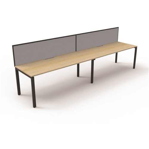 With Screen Natural White Worksurface With 410mm W x 50mm D Scallop Cable Access 3600mm W x 780mm D x 730mm H (Overall), 1800mm W x 750mm D x 730mm H Per User 60mm x 30mm Profile Leg Underframe In Black P/C 495mm H x 30mm T Pinnable Privacy Screen Upholstered In Grey Fabric With Matching Black Powdercoat Extrusion Adjustable Levelling Feet 5 Year Manufacturer's Warranty