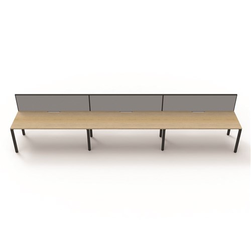 With Screen Natural White Worksurface With 410mm W x 50mm D Scallop Cable Access 4500mm W x 780mm D x 730mm H (Overall), 1500mm W x 750mm D x 730mm H Per User 60mm x 30mm Profile Leg Underframe In Black P/C 495mm H x 30mm T Pinnable Privacy Screen Upholstered In Grey Fabric With Matching Black Powdercoat Extrusion Adjustable Levelling Feet 5 Year Manufacturer's Warranty