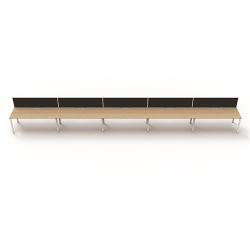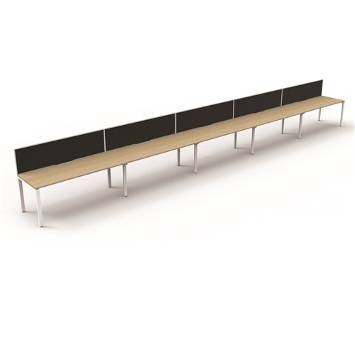 With Screen Natural White Worksurface With 410mm W x 50mm D Scallop Cable Access 6000mm W x 780mm D x 730mm H (Overall), 1200mm W x 750mm D x 730mm H Per User 60mm x 30mm Profile Leg Underframe In White P/C 495mm H x 30mm T Pinnable Privacy Screen Upholstered In Black Fabric With Matching White Powdercoat Extrusion Adjustable Levelling Feet 5 Year Manufacturer's Warranty