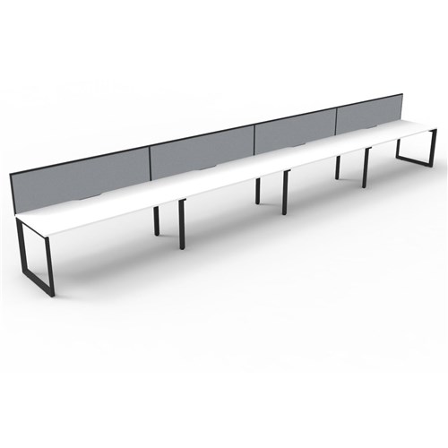 With Screen Natural White Worksurface With 410mm W x 50mm D Scallop Cable Access 4800mm W x 780mm D x 730mm H (Overall), 1200mm W x 780mm D x 730mm H Per User 60mm x 45mm Bevelled Edge Loop Leg Underframe In Black Powdercoat 495mm H x 30mm T Pinnable Privacy Screen Upholstered In Grey Fabric With Matching Black Powdercoat Extrusion Adjustable Levelling Feet 5 Year Manufacturer's Warranty