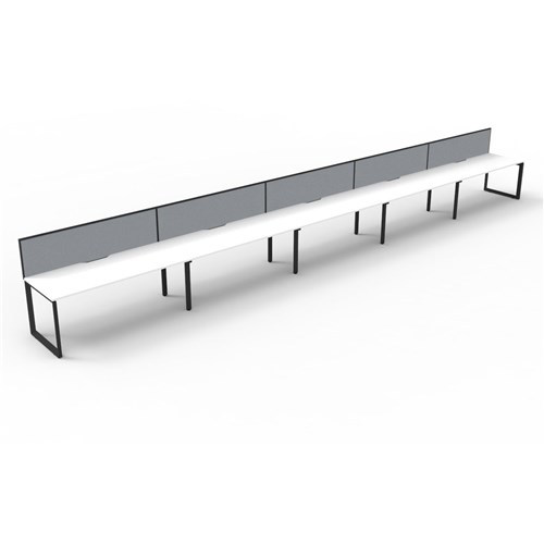 With Screen Natural White Worksurface With 410mm W x 50mm D Scallop Cable Access 7500mm W x 780mm D x 730mm H (Overall), 1500mm W x 780mm D x 730mm H Per User 60mm x 45mm Bevelled Edge Loop Leg Underframe In Black Powdercoat 495mm H x 30mm T Pinnable Privacy Screen Upholstered In Grey Fabric With Matching Black Powdercoat Extrusion Adjustable Levelling Feet 5 Year Manufacturer's Warranty