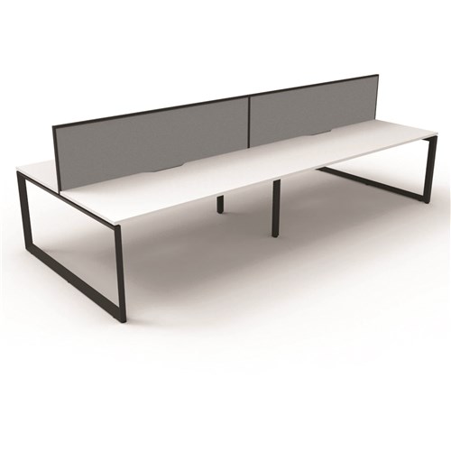 With Screen Natural White Worksurface With 410mm W x 50mm D Scallop Cable Access 3000mm W x 1530mm D x 1200mm H (Overall),1500mm W x 750mm D x 730mm H Per User 60mm x 45mm Bevelled Edge Loop Leg Underframe In White Powdercoat 495mm H x 30mm T Pinnable Privacy Screen Upholstered In Grey Fabric With Matching Black Powdercoat Extrusion Adjustable Levelling Feet 5 Year Manufacturer's Warranty