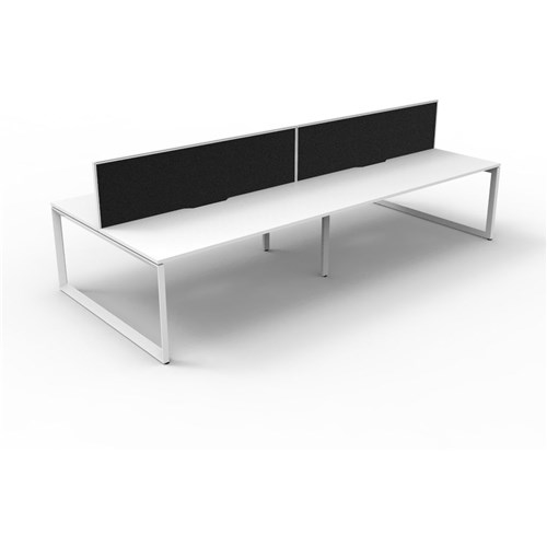 With Screen Natural White Worksurface With 410mm W x 50mm D Scallop Cable Access 3600mm W x 1530mm D x 1200mm H (Overall),1800mm W x 750mm D x 730mm H Per User 60mm x 45mm Bevelled Edge Loop Leg Underframe In White Powdercoat 495mm H x 30mm T Pinnable Privacy Screen Upholstered In Black Fabric With Matching White Powdercoat Extrusion Adjustable Levelling Feet 5 Year Manufacturer's Warranty