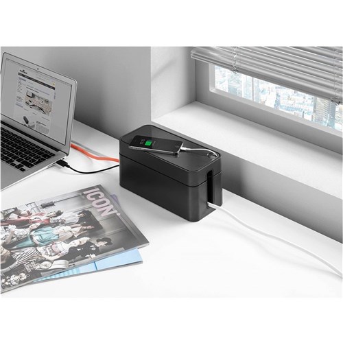 Elegant cable box to hold cables and 3-socket strip Double-sided rubberised cable outlet slots for easy handling and ideal air circulation Cover with practical, circular cable opening for mobile phone charging cable High-quality, flame-retardant plastic Large rubber pads for non-slip stability Dimensions: 246 x 116 x 128 mm (W x H x D)