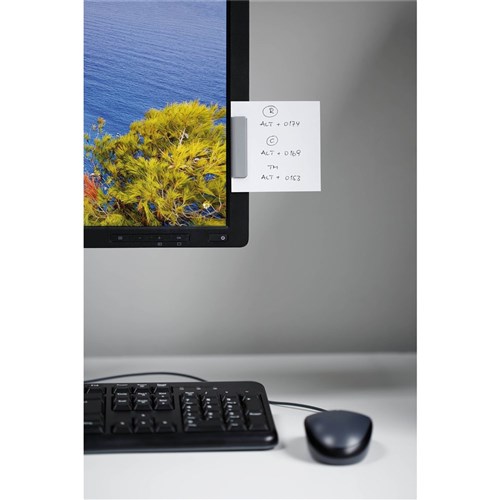 Magnetic clip for notes, reminders and appointments etc. Self-adhesive attachment on smooth, attachable surfaces such as cabinets, fridges, glass doors or showcases Residue-free removal from smooth, attachable surfaces Attachment of clip on side or top of document depending on space needs