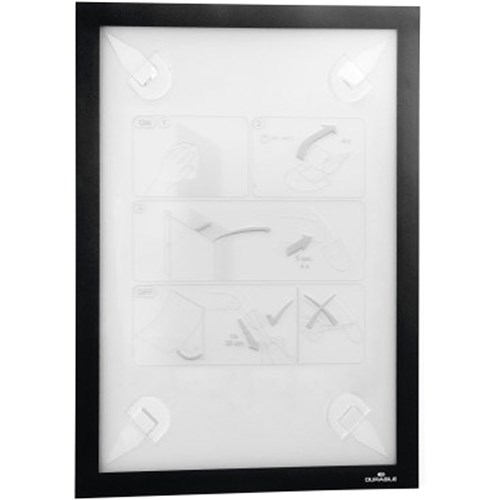Presenting information in a high quality and professional way Quick insertion and exchange of documents via a fold-back magnetic frame Can be attached to wallpaper, wood and most plastics thanks to the use of adhesive strips
