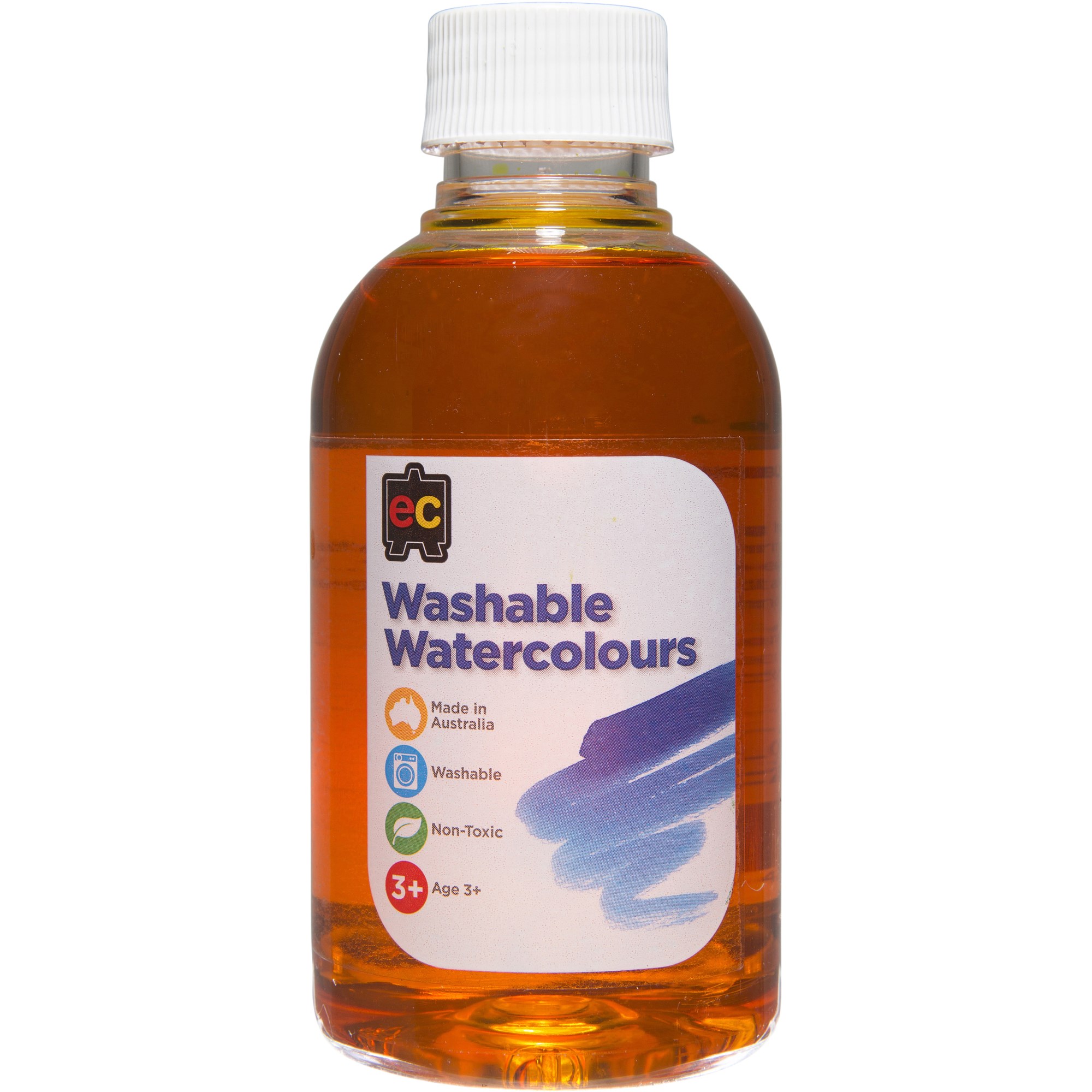These Australian made, non-toxic, Washable Watercolours provide both brilliant colour and hours of creative fun to any classroom or home. With dazzling colours available in 250ml bottles, these paints will help you achieve that special watercolour effect! Can be used in a variety of ways including watercolour painting, tinting pigments or as craft dyes. Suitable for a wide variety of surfaces including paper, cardboard, glue, fabric, wood and wool. Use with a variety of applicators including brushes, spray bottles, droppers and sponges. Are washable from skin and fabrics.