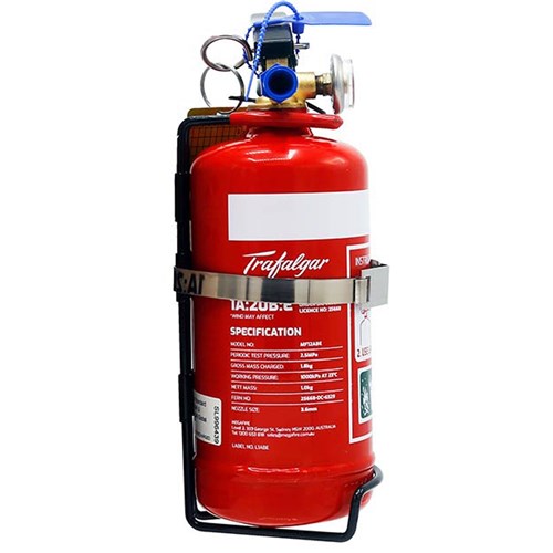 Certified to australian standards as184. Powder coated mild steel cylinders. Forged brass discharge valve. Powder coated handle and trigger. 40% map powder . 1kg and 2kg extinguisher supplied with heavy duty vehicle bracket. 45kg and 9kg extinguisher supplied with wall hook for mounting.