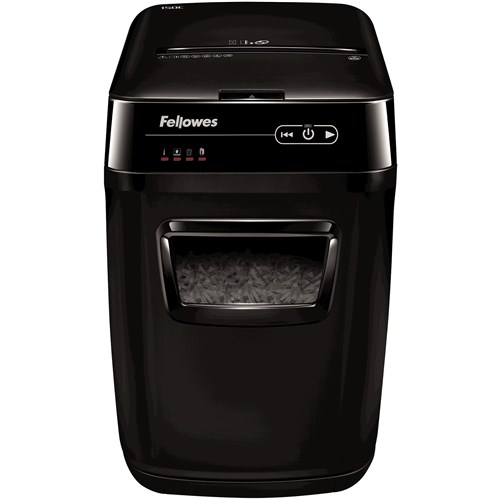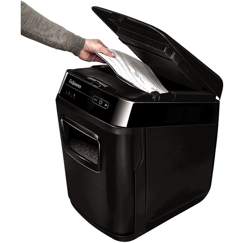 Automatic shredding for maximum productivity. 150 sheet automatic and 8 sheet manual shredding capacities. Auto Reverse stops and reverses paper if a jam occurs. SilentShredâ„¢ offers ultra-quiet performance for shared workshpaces. Sleep Mode feature shuts down the shredder after 2 minutes of inactivity. Shreds documents into 4x50 mm cross-cut particles (Security Level P-4). 32 litre pull-out waste bin for easy emptying. 2 year product and service plus 5 year Manufacturer's Warranty on cutter.