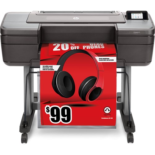 • Finished output handling: Two automatic roll feeds, smart roll-switching, top sheet feed, media output bin, automatic horizontal cutter and vertical trimmer (cuts all HP Z-series printer-qualified media, including most canvas).