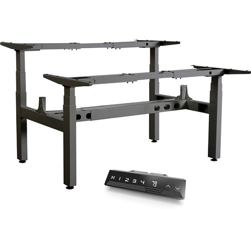 Back to back desk system 3 stage leg with 4 motor activation, heavy duty steel construction ensuring increased stability Expandable framework for various top panel lengths, 3 stage memory storage height adjustment using a push button, auto stop function if the desk encounters a obstacle on the way down Dynamic load push: 600N each leg, maximum lift capacity is 120kg each desk, speed at full load: 35mm/S Lowest position: 593mm (Not including top), highest position: 1,243mm (Not including top) Minimum extension length: 1,800mm, minimum depth of the desktop recommended is 600mm Available as standard in White, with Black and Grey, suits Top panel Sizes = 2,100mm, 1,800mm, 1,500mm, 1,200mm x 700mm (Or any size between. Minimum depth of the desktop recommended is 600mm) All adjustments for the height are infinitely locking, 25mm thick table top is a suggested thickness, solid steel frame construction with a powder coated finish Some assembly required AFRDI Approved