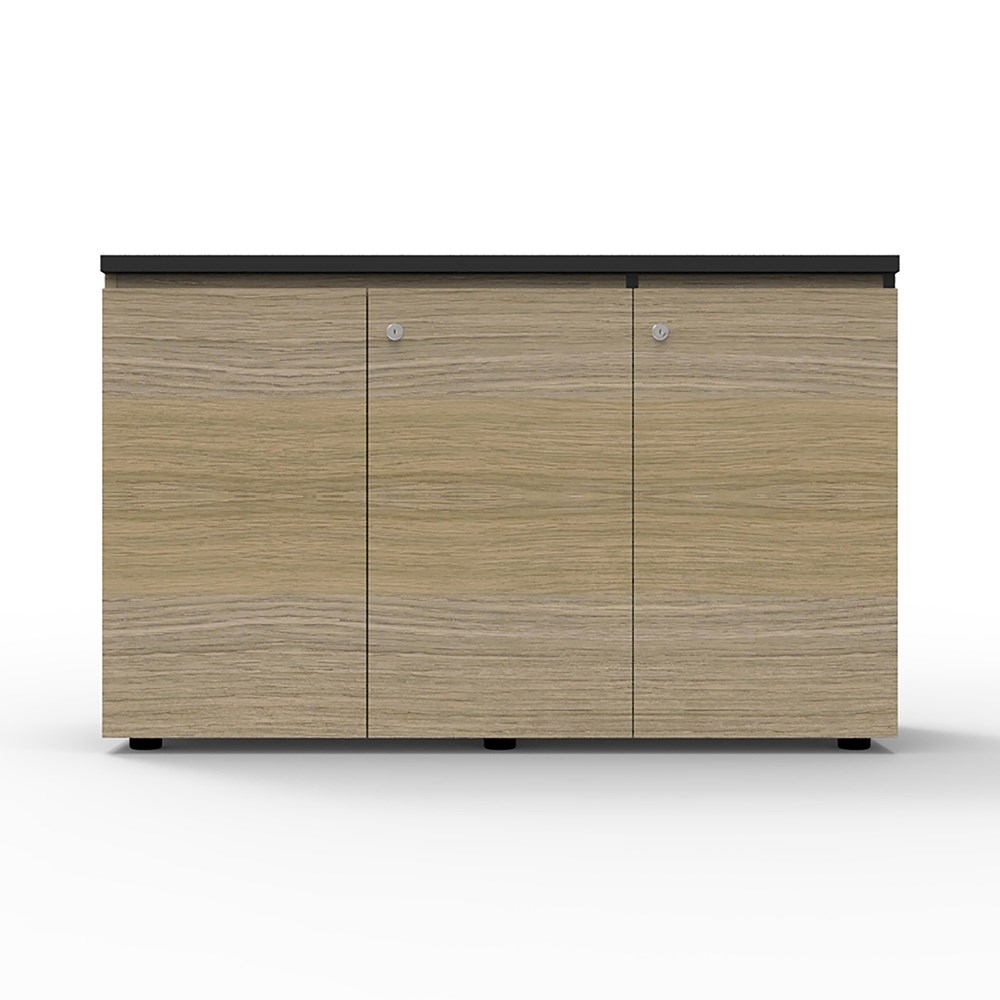 Deluxe Infinity Swing 3 Door Cupboard 1200mm W x 450mm D x 730mm H Shark Nose Feature On Top Door Front For Easy Opening Lockable, Supplied With 2 x Keys Finished In Laminate With Black Rigid Edging Adjustable Levelling Feet