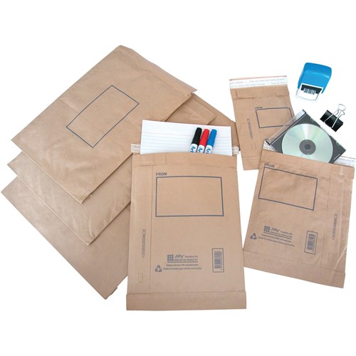 Rugged, all purpose, paper-fibre cushioned mailers. Constructed from heavy duty kraft paper with a uniform, 100% recycled inner batting (ground-up paper and newsprint) that provides excellent protection. Self-seal closure and easy opening tear-tape.