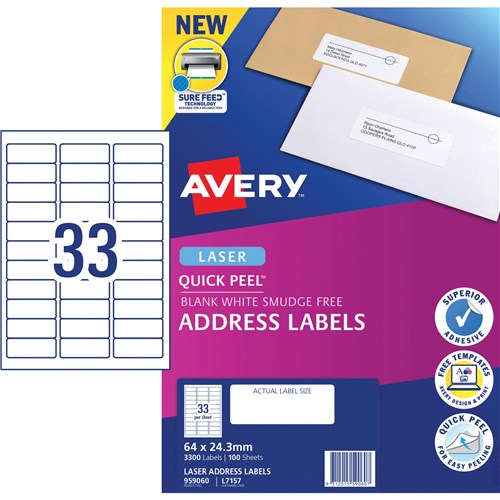 • Size: 64x24.3mm 3300 labels, 100 sheets, 33 labels per sheet (33UP).