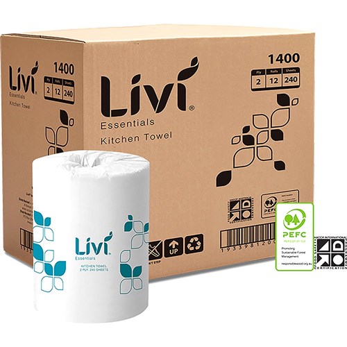 The Livi Essentials Kitchen Towel 2ply hand roll towel is a disposable kitchen towel for drying. The 2ply 240s roll dry PEFC certified guaranteeing environmentally responsible purchasing.