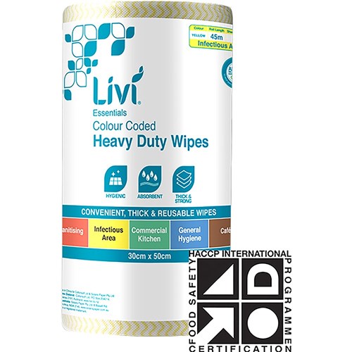 The Livi Yellow commercial wipe has 90 sheets per roll & is perforated for controlled usage. HACCP certified, each non woven wipe is 70 grams per square metre making them thick & strong for extra absorbent results. 4 rolls available per carton.